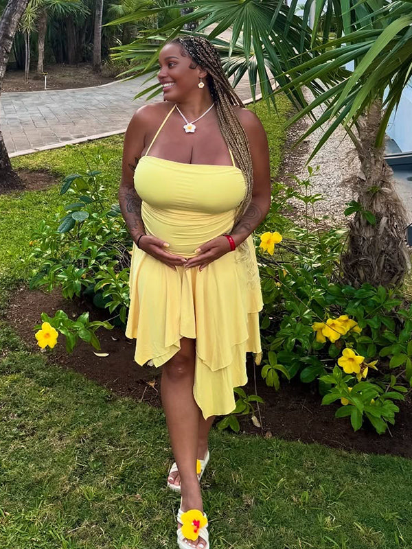 Momyknows Yellow Irregular Halter Neck Ruched Maternity Photoshoot Mini Dress