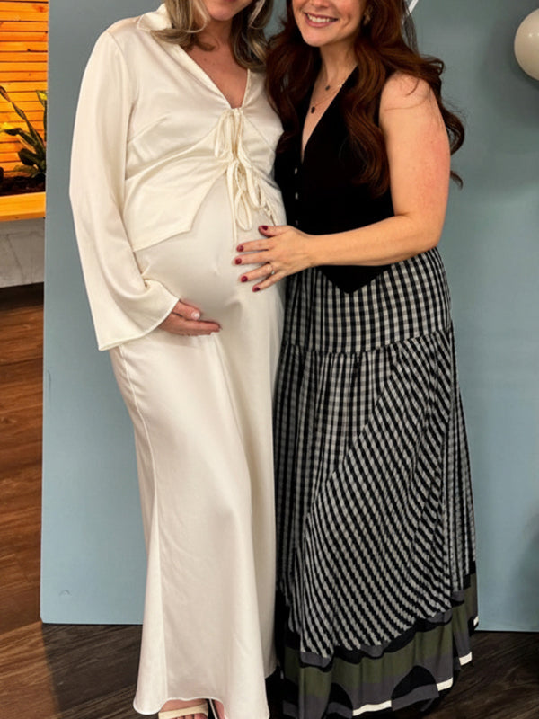 Momyknows Cream White Satin Lace-up Bow Two Piece Set Maternity Maxi Dress