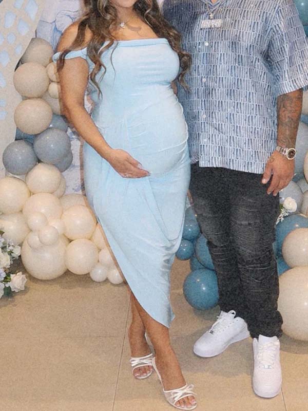 Momyknows Blue Off Shoulder Ruched Irregular Hem Bodycon Maternity Midi Dress