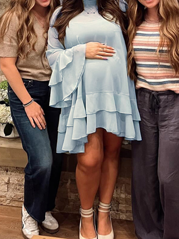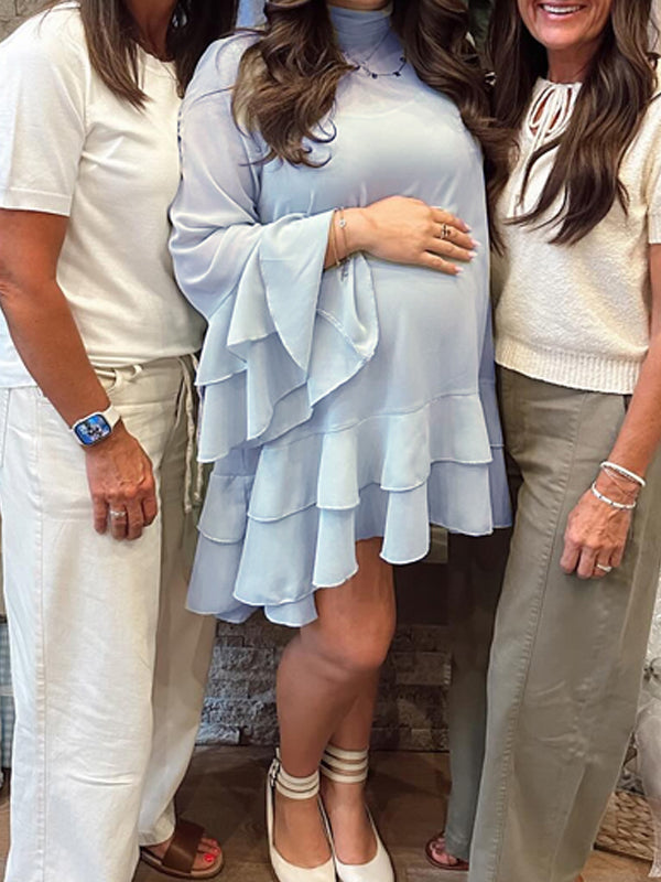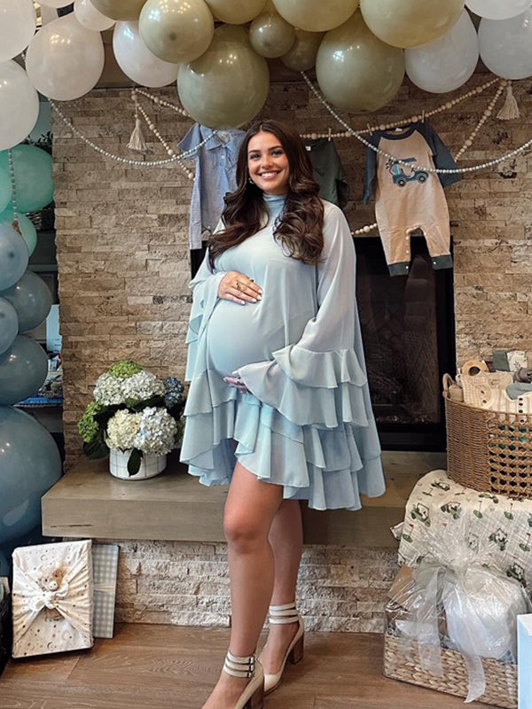 Momyknows Light Blue Tache Falbala Flare Sleeve Maternity Baby Shower Mini Dress