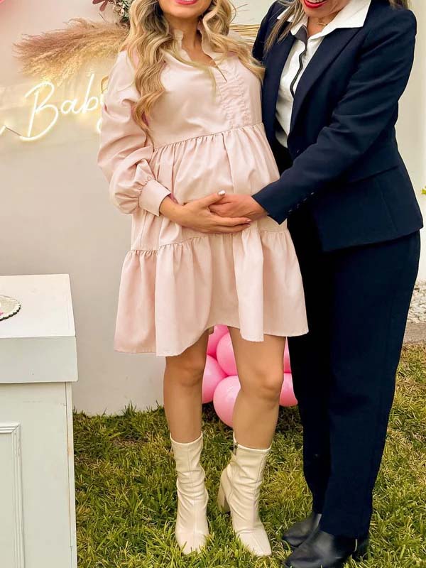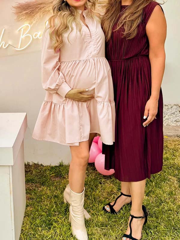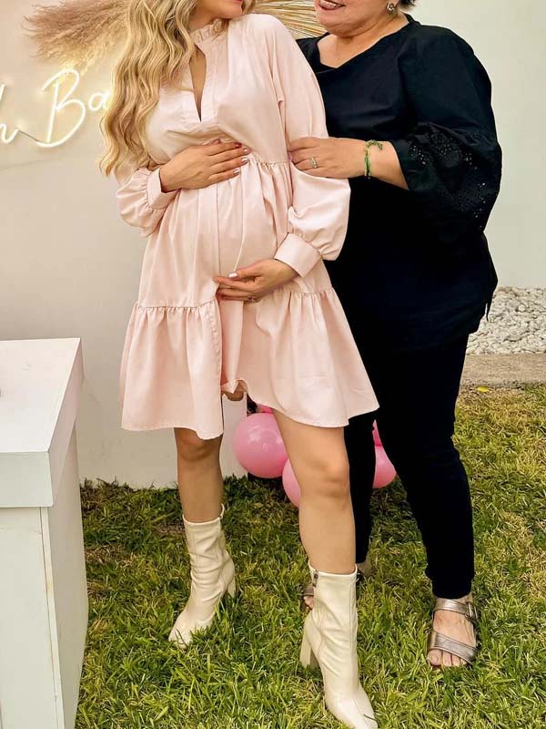 Momyknows Pink Ruched Deep V-neck Maternity Baby Shower Mini Dress
