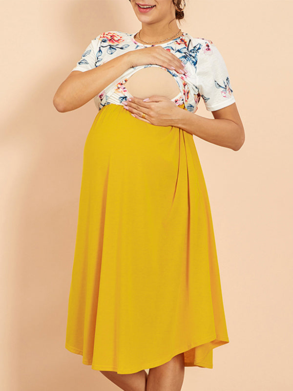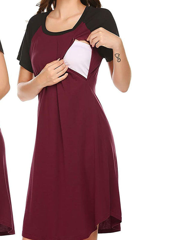Momyknows Round Neck Spliced Maternity and Lactant Women Daily Home Maternity Nursing Dresses