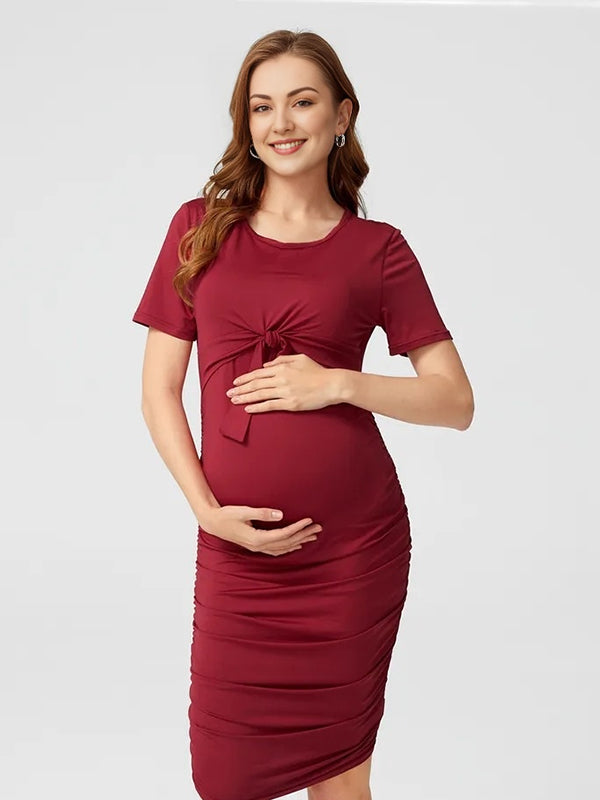 Momyknows Wine Red Round Neck Short Sleeve lace-up Casual Daily Maternity Nursing Dresses