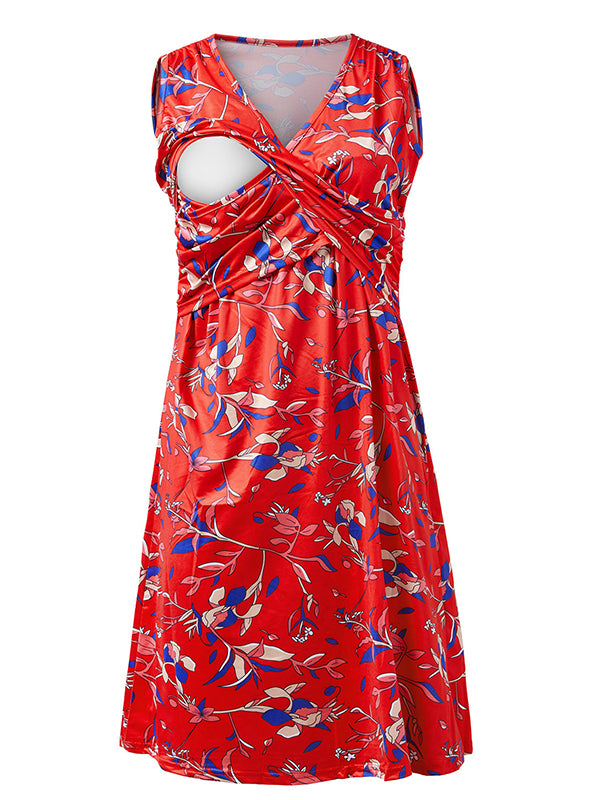 Momyknows Red Print Flowers Sleeveless V-neck Casual Daily Maternity Nursing Dresses