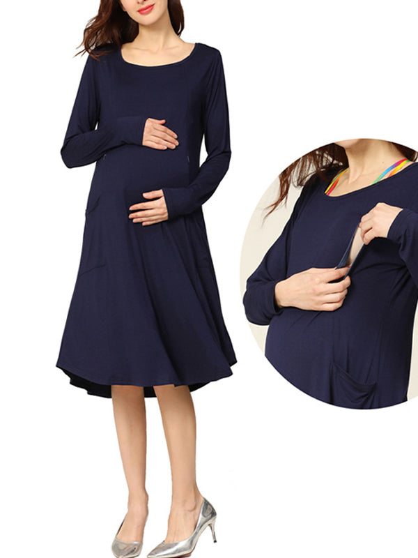 Momyknows Dark Blue Round Neck Long Sleeve Pockets Flowy Casual Daily Maternity Nursing Dresses