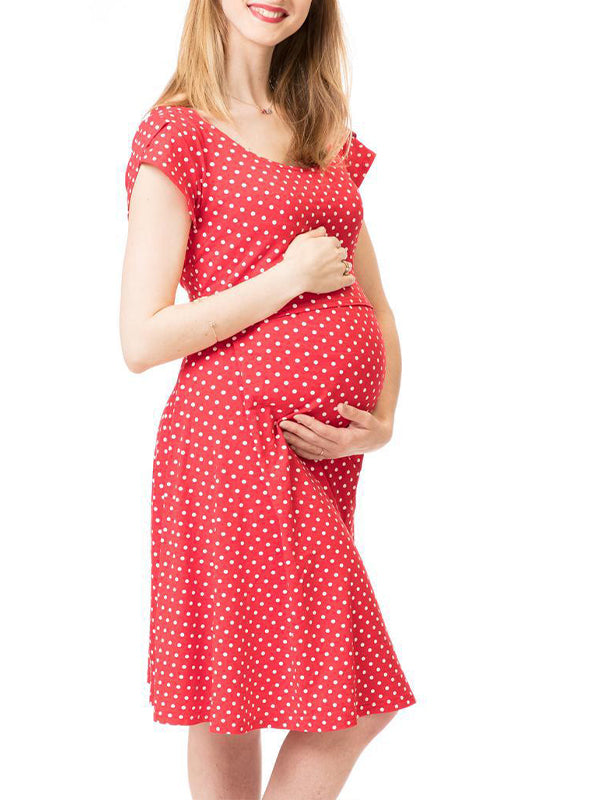 Momyknows Red White Polka Dot Round Neck Short Sleeve Casual Daily Maternity Nursing Dresses