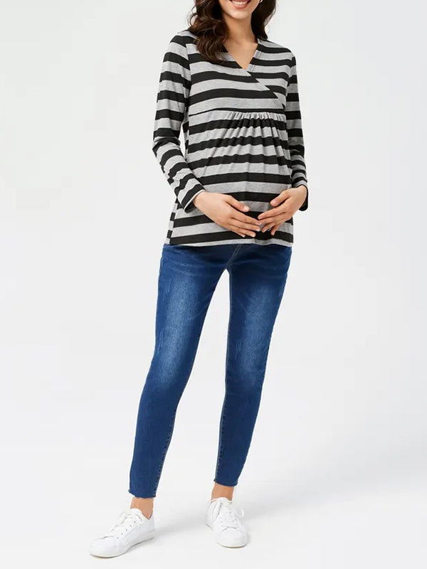 Momyknows Grey V Neck Striped Daily Going Out Maternity Nursing Top