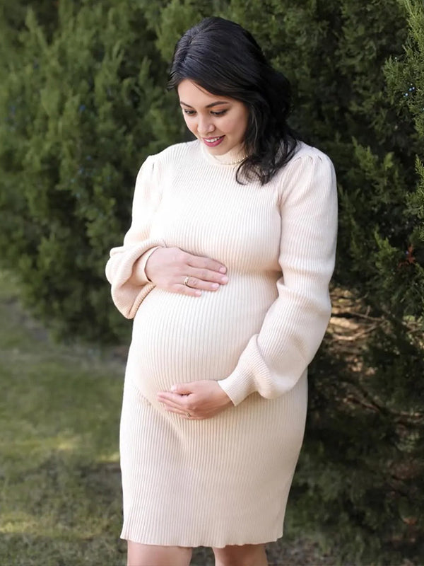 Momyknows Apricot Knit Semi-High Neck Lantern Sleeve Maternity Sweater Mini Dress
