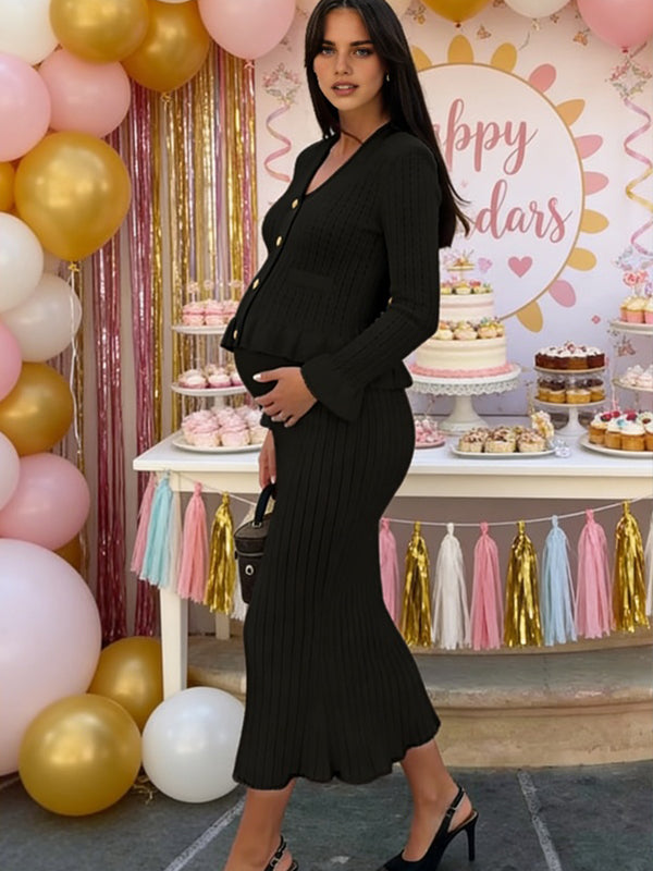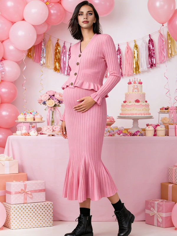 Momyknows Falbala Crochet Pocket Tache Two Piece Maternity Sweater Baby Shower Maxi Dress