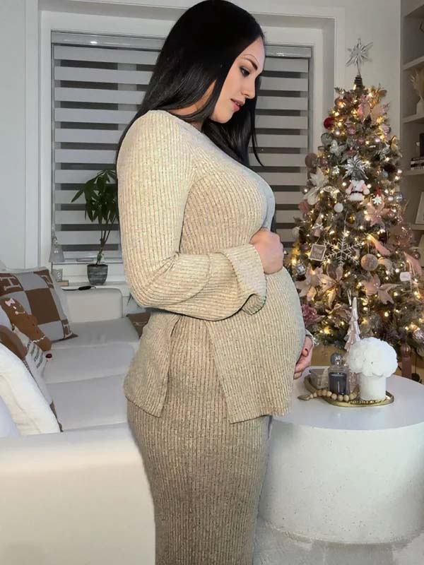 Momyknows Khaki Side Slit Crochet Two Piece Maternity Photoshoot Suit