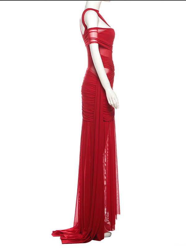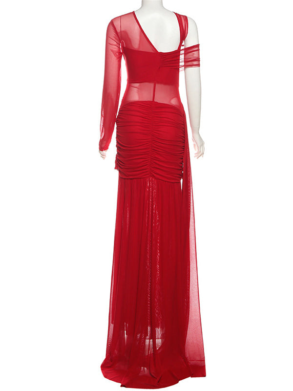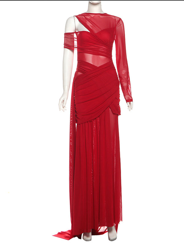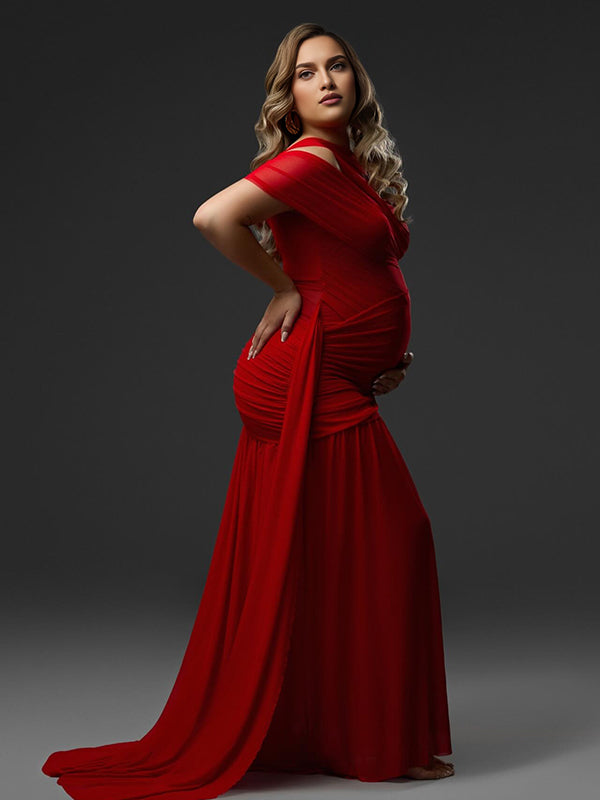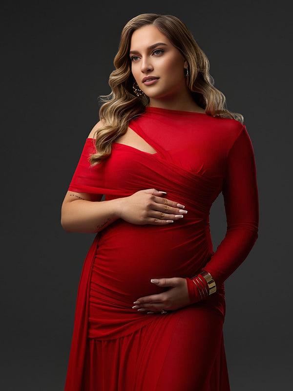 Momyknows Red Mesh Irregular Ruched Cut Out Draped Mermaid Sheer Maternity Maxi Dress