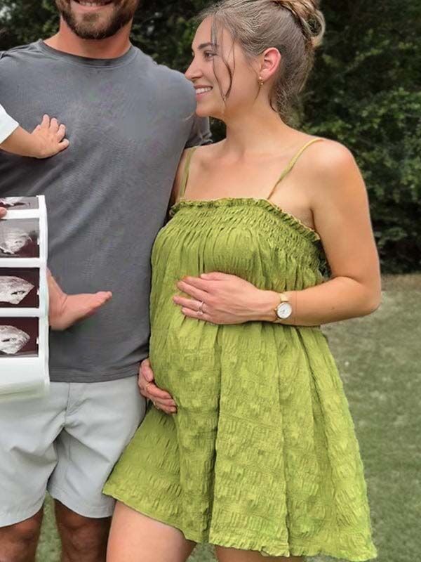Momyknows Green Smocked Spaghetti Strap Ruched Maternity Photoshoot Mini Dress