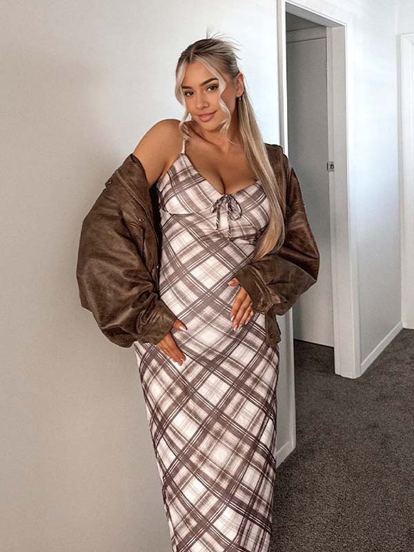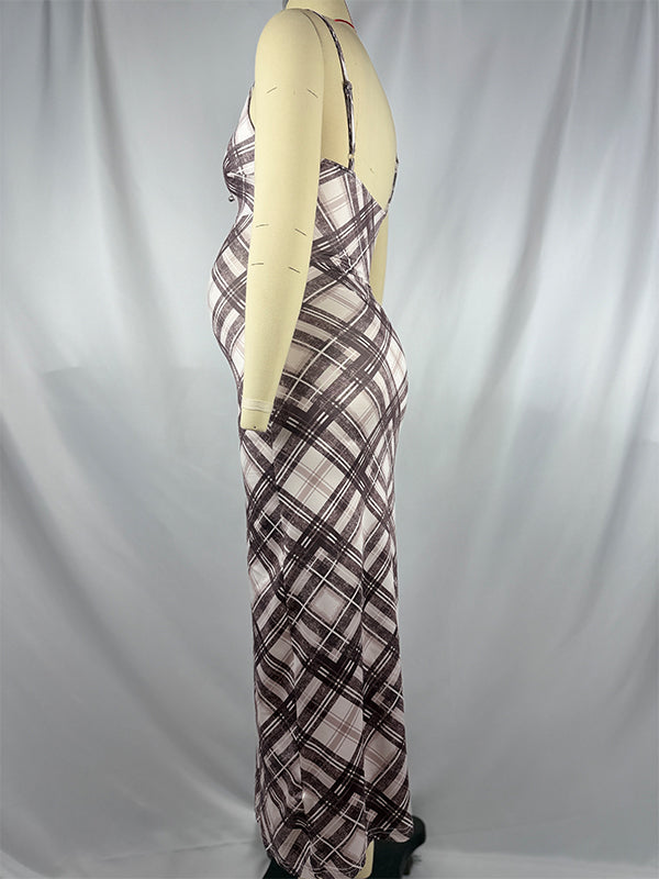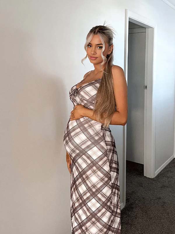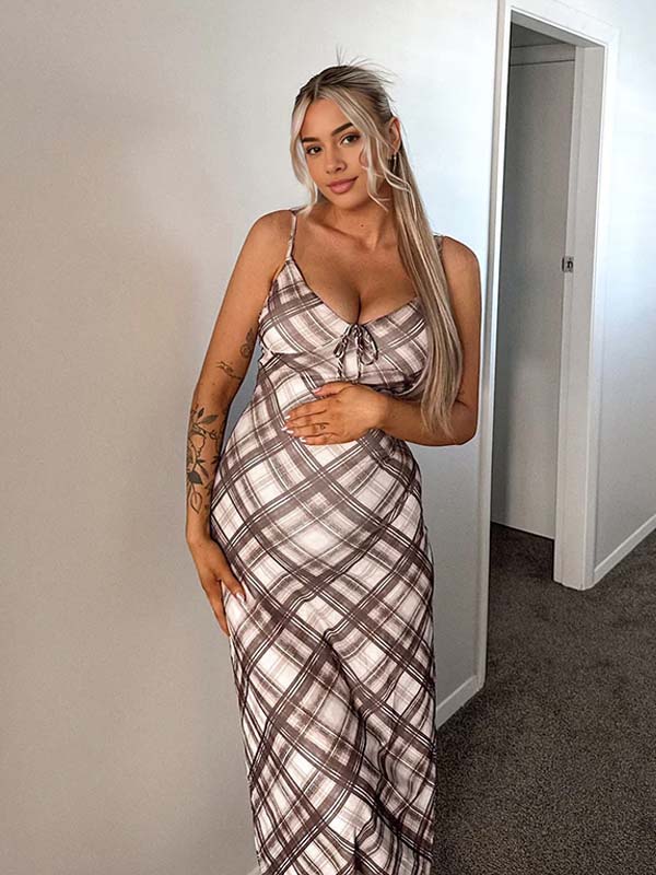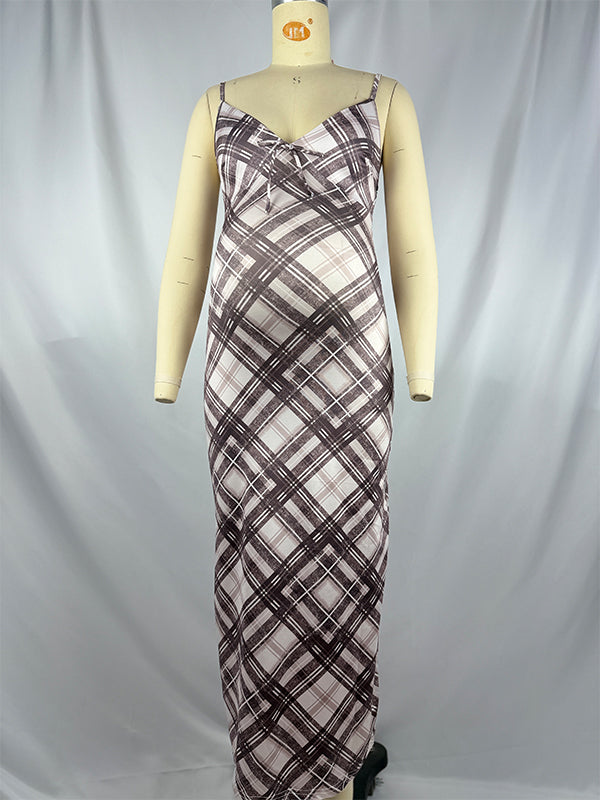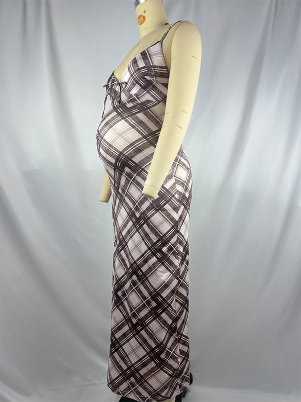 Momyknows Plaid Tie Cami V-neck Backless Fashion Maternity Maxi Dress