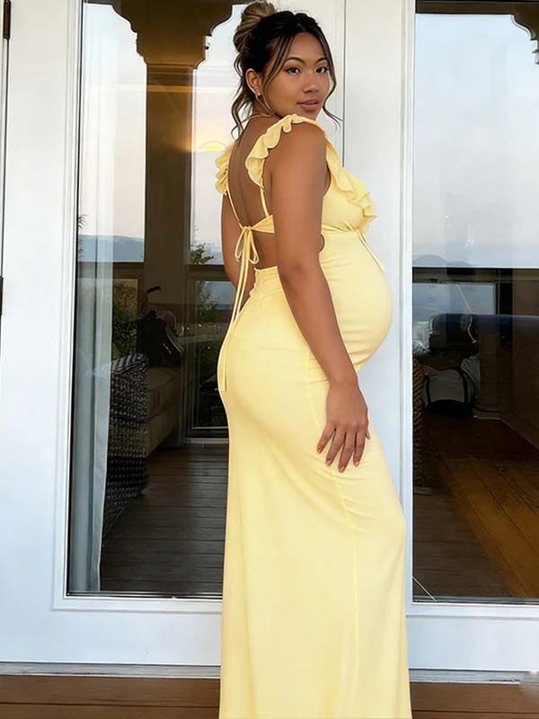 Momyknows Chic Yellow Backless Side Slit Side Draped Cascading Ruffle Cocktail Baby Shower Maternity Maxi Dress