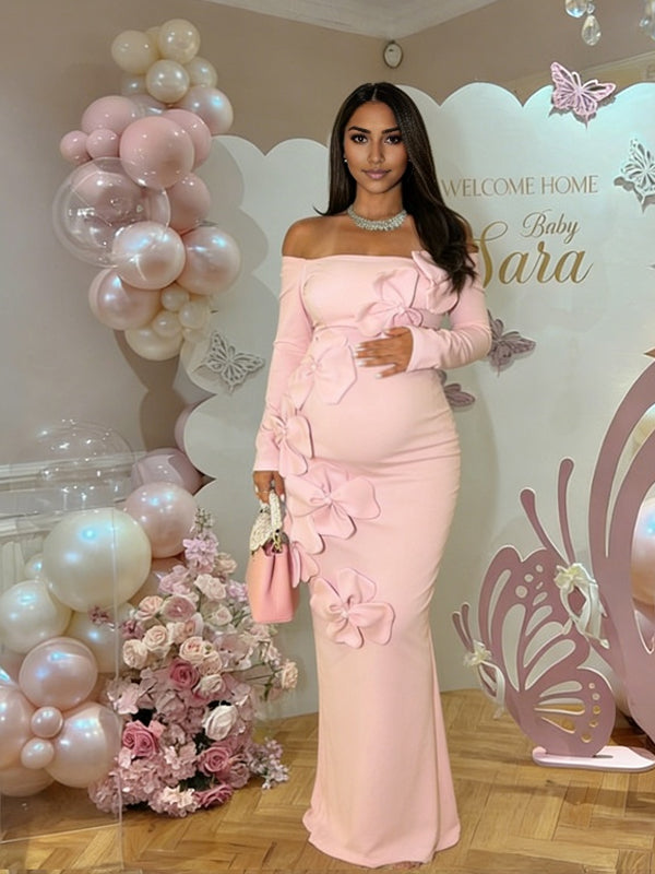 Momyknows Pink Off Shoulder 3D Flower Backless Maternity Baby Shower Maxi Dress