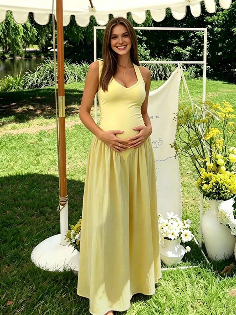 Momyknows Halter Neck Backless Ruched Lace Up Maternity Baby Shower Maxi Dress