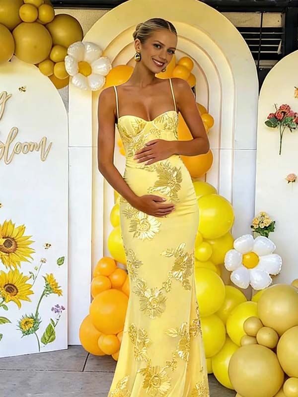Momyknows Floral Ribbon Appliques Bodice Backless Cami Mermaid Maternity Maxi Dress