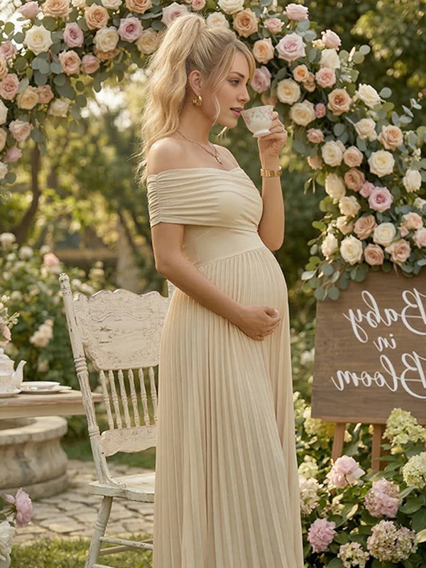 Momyknows Apricot Off Shoulder Cross Chest Pleated Big Swing Maternity Maxi Dress