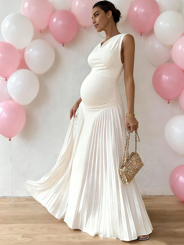 Momyknows Chic White Pleated A-Line Cocktail Baby Shower Maternity Maxi Dress
