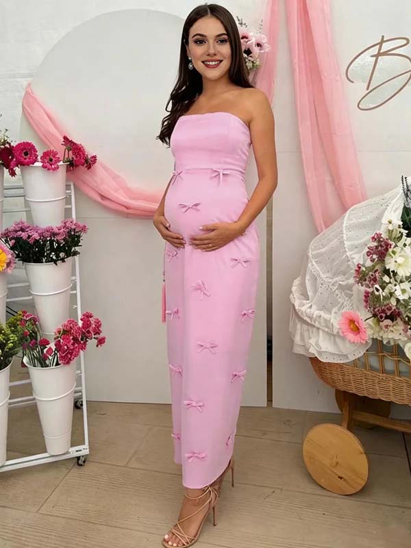 Momyknows Pink 3D Bow Bandeau Bodycon Baby Shower Maternity Maxi Dress