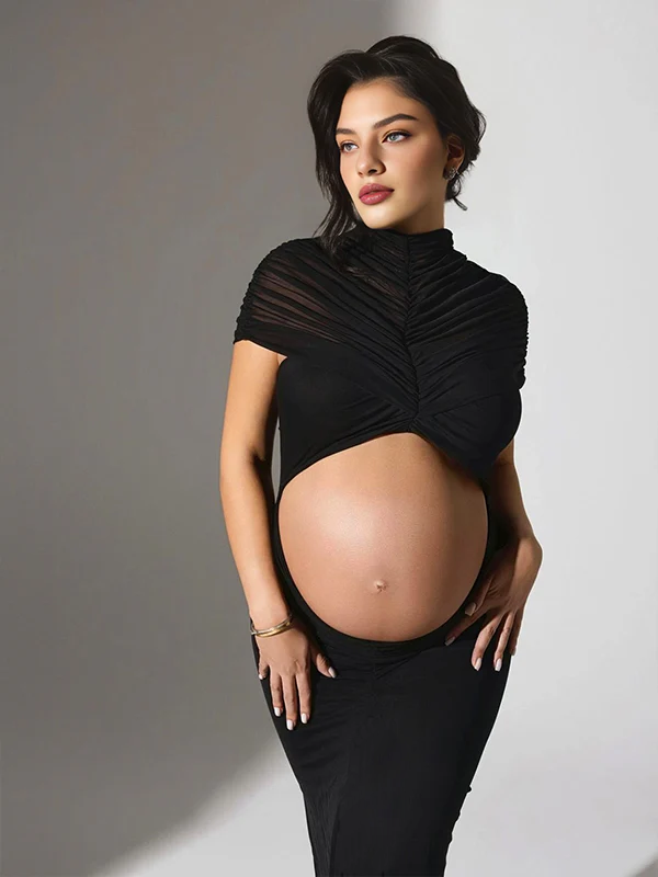 Momyknows Black Bare Sheer Midriff Grenadine Maternity Photoshoot Maxi Dress