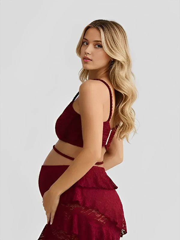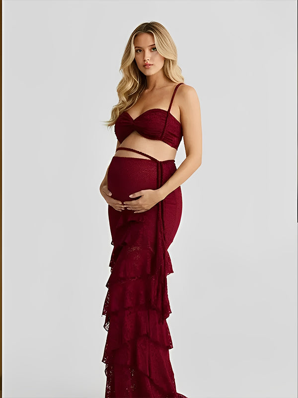 Momyknows Lace Ruffle Draped Crop Cami Two Piece Set Maternity Photoshoot Maxi Dress