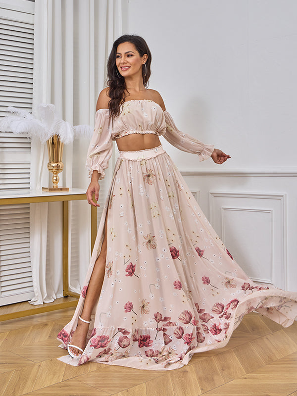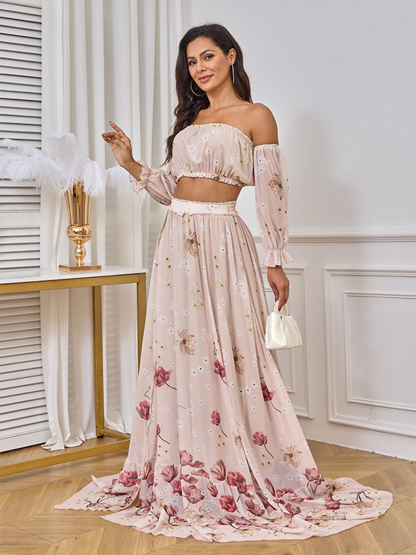 Momyknows Two Piece Boho Flower Printing Off Shoulder Chiffon Crop Bandeau Photoshoot Maternity Maxi Dress