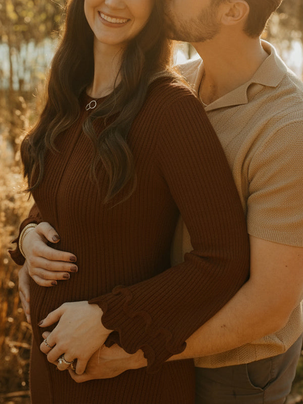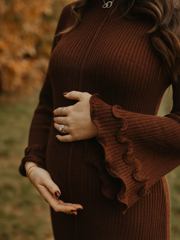 Momyknows Brown Knit Ruffle Beackless Flare Sleeve Maternity Maxi Dress