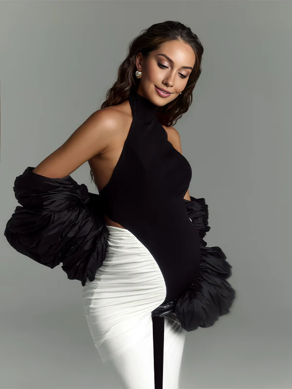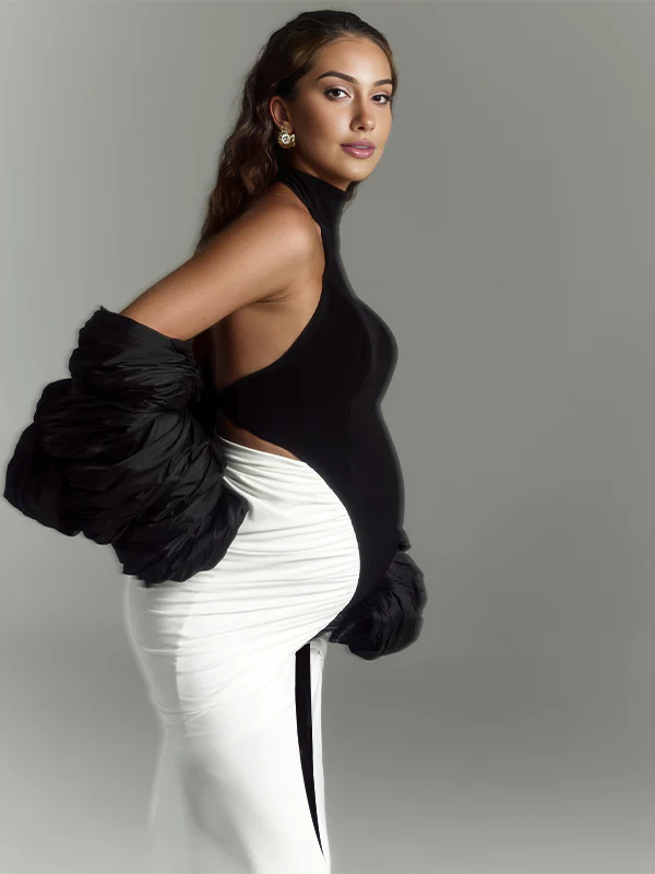 Momyknows Hit Color Ruched Backless Slit Photoshoot Maternity Maxi Dress