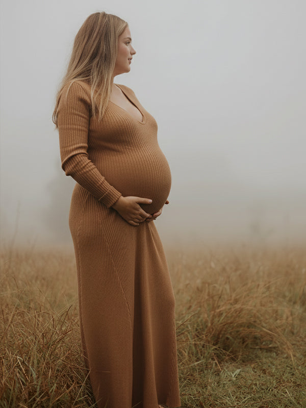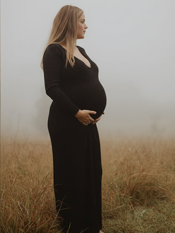 Momyknows Knit V-neck Long Sleeve Bodycon Basic Maternity Maxi Dress