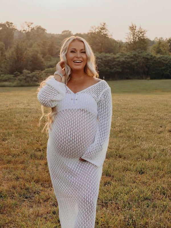 Momyknows White Cut Out Backless Flare Sleeve Beach Cover Up Baby Shower Photoshoot Maternity Maxi Dress