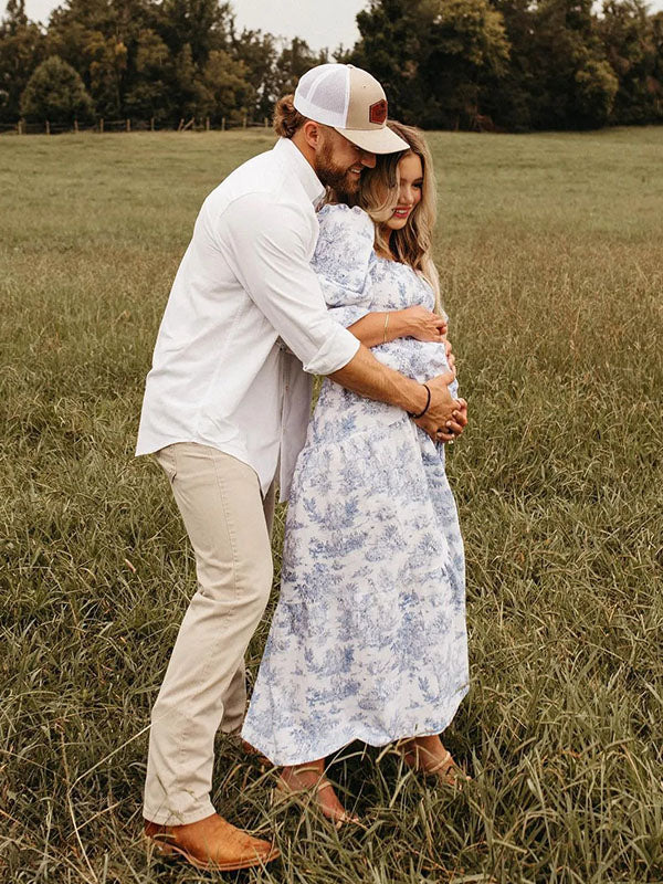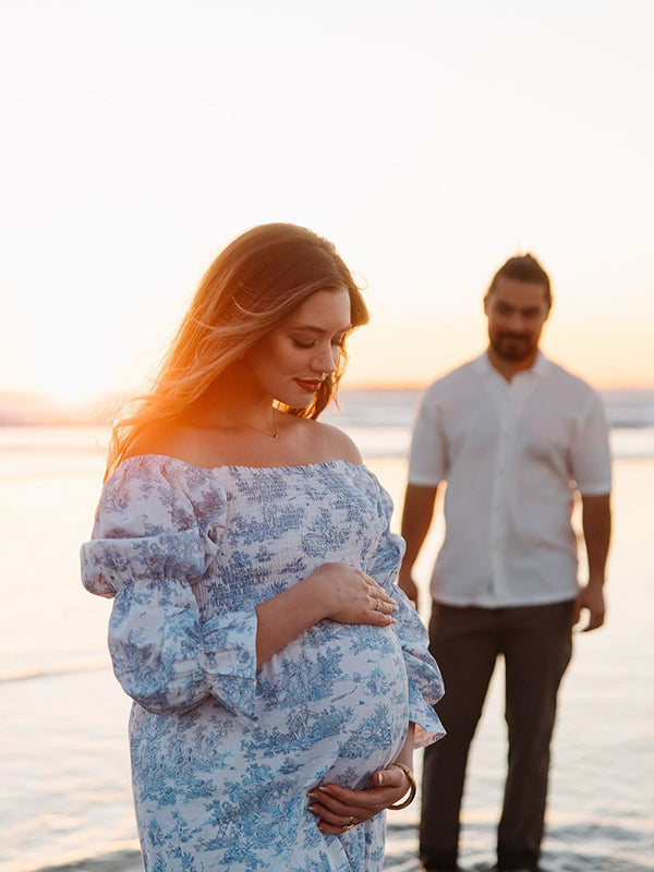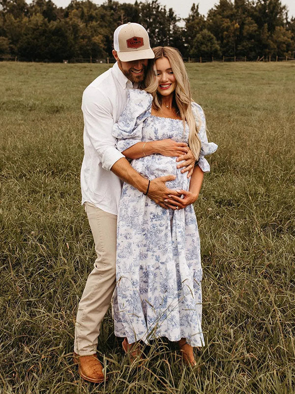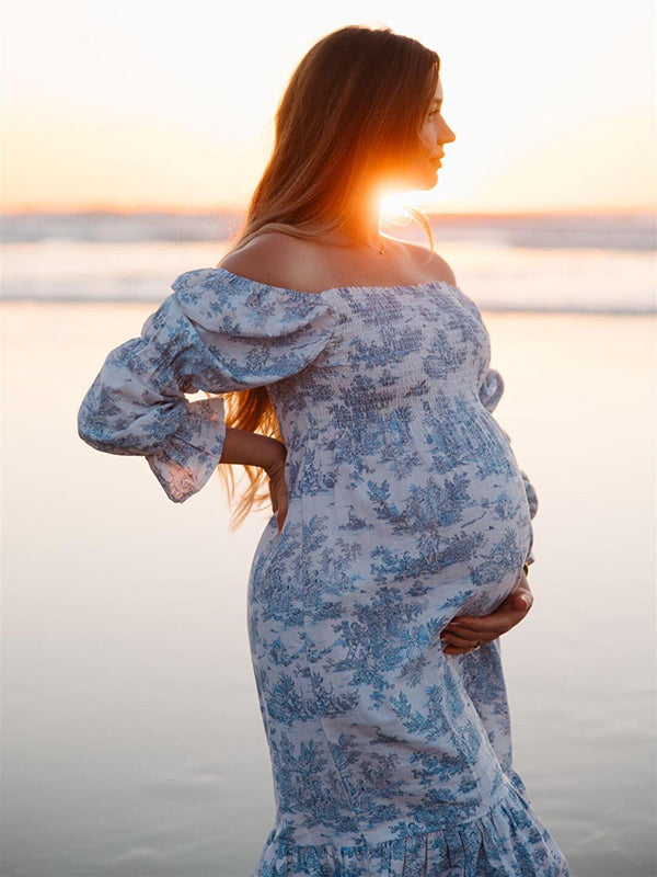 Momyknows Ruffle Ruched High Waist Puff Sleeve Cute Photoshoot Maternity Maxi Dress