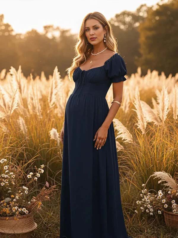 Momyknows Ruffle Ruched Lace-Up Big Swing Boho Maternity Maxi Dress