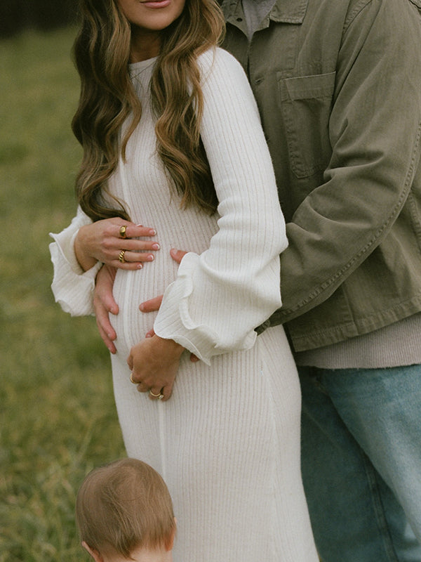 Momyknows White Knit Pleated Tie Back Ruffle Falbala Frill Hem Backless Big Swing Elegant Cocktail Party Gown Maternity Photoshoot Baby Shower Maxi Dress