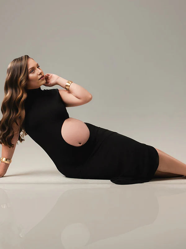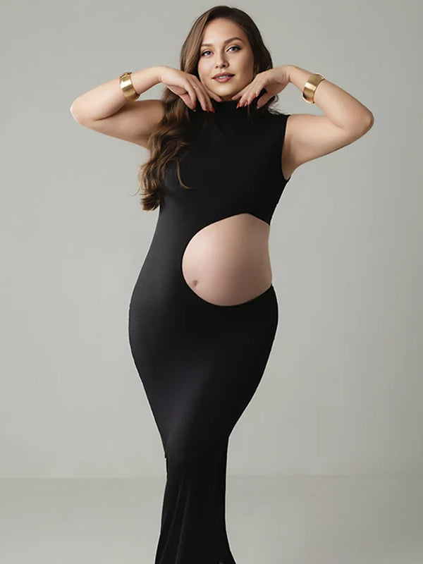 Momyknows Black Half-High Collar Crop Top Maternity Photoshoot Maxi Dress