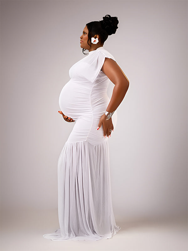 Momyknows White Ruched Grenadine Sheer Photoshoot Maternity Maxi Dress