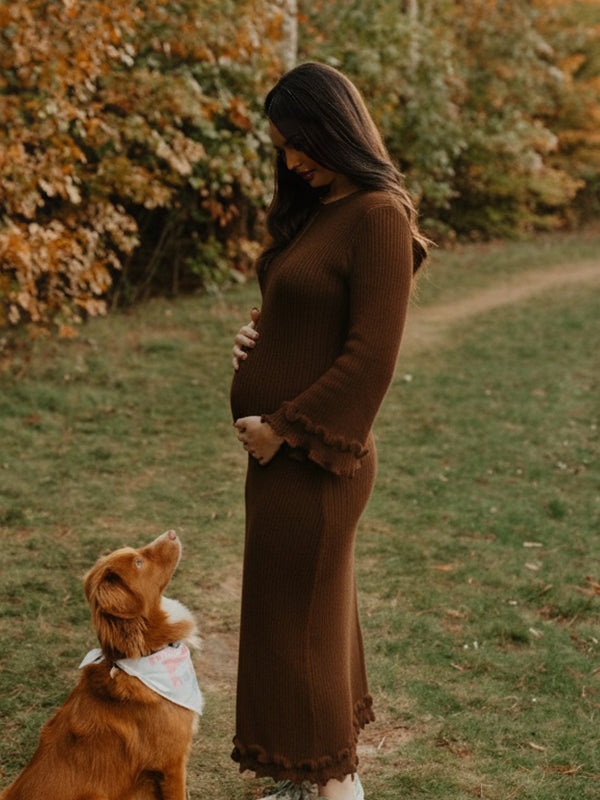 Momyknows Brown Knit Ruffle Beackless Flare Sleeve Maternity Maxi Dress