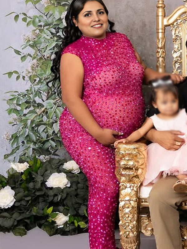 Momyknows Gold Rhinestone Mesh Sleeveless Backless Photoshoot Bodycon Evening Plus Size Maternity Maxi Dress