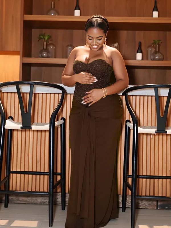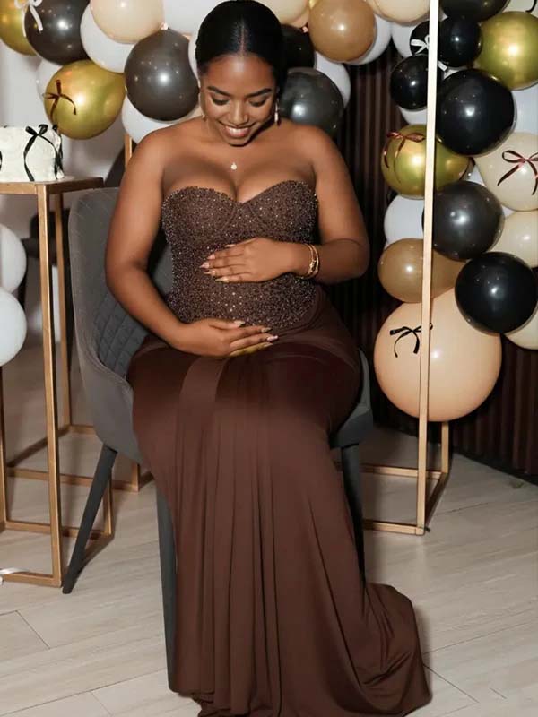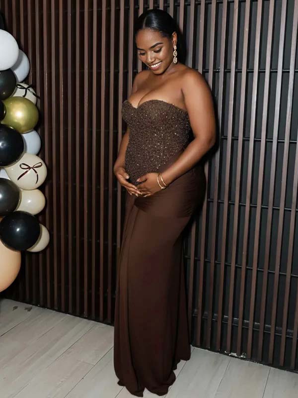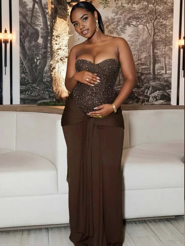 *1/13 PRE-ORDER* Momyknows Sequin Bandeau Ruched Knot Draped Bodycon Maternity Maxi Dress