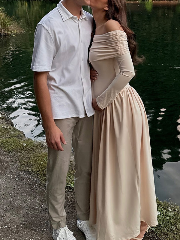 Momyknows Apricot Off Shoulder Ruched Big Swing Maternity Maxi Dress