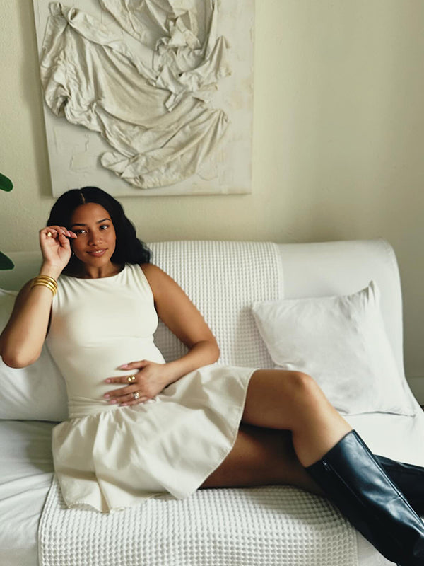 Momyknows Apricot Spliced Ruched Maternity Photoshoot Mini Dress