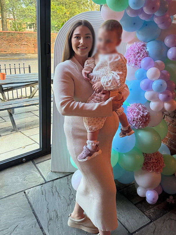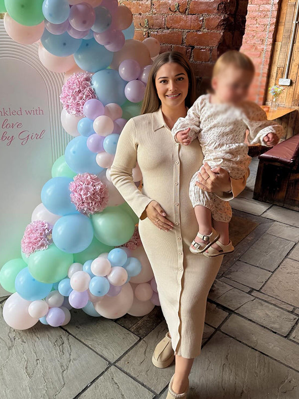 Momyknows Apricot Turndown Collar Crochet Button Maternity Sweater Baby Shower Maxi Dress