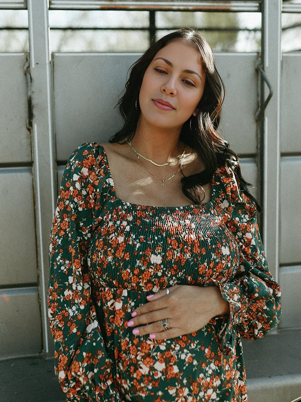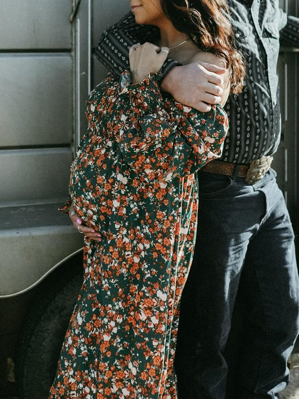 Momyknows Green Off Shoulder Print Smocked Maternity Photoshoot Maxi Dress