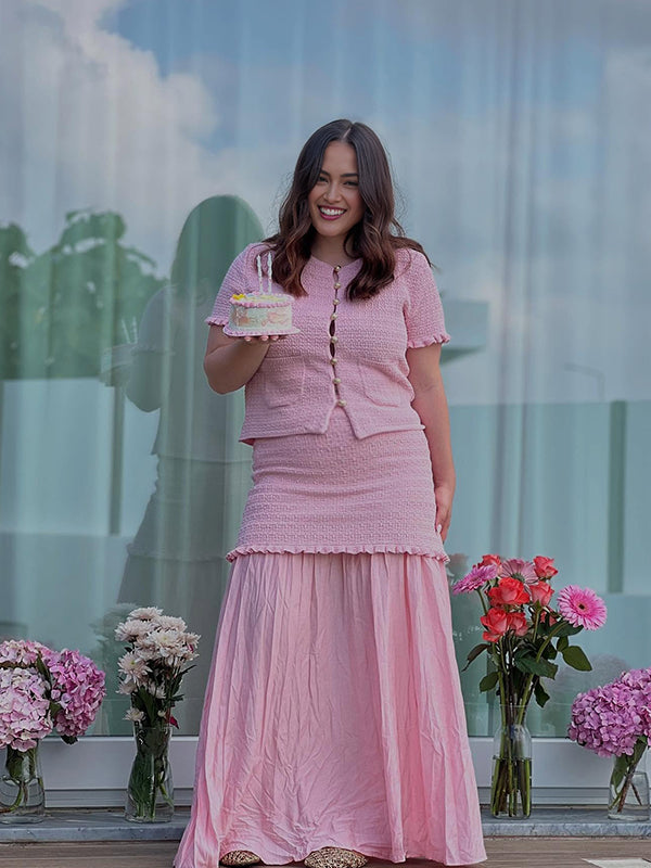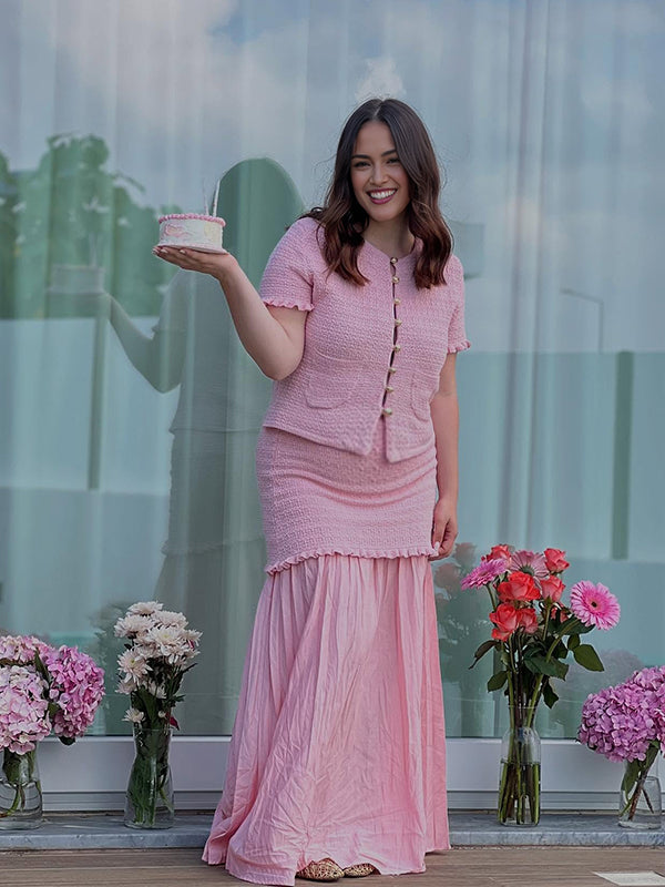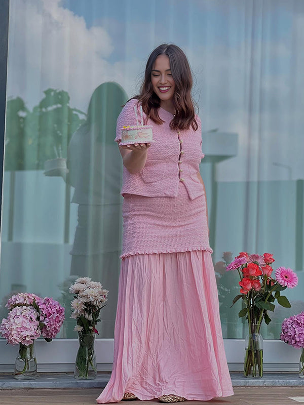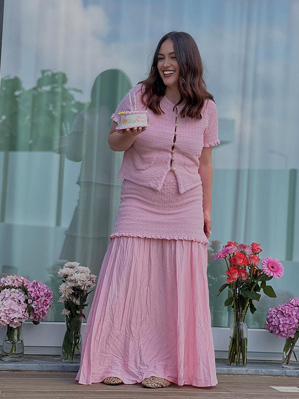 Momyknows Pink Crochet Pleated Button Two Piece Maternity Baby Shower Maxi Dress