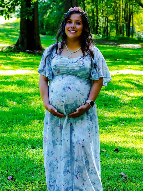 Momyknows Ruched Flutter Sleeve Print Maternity Photoshoot Maxi Dress