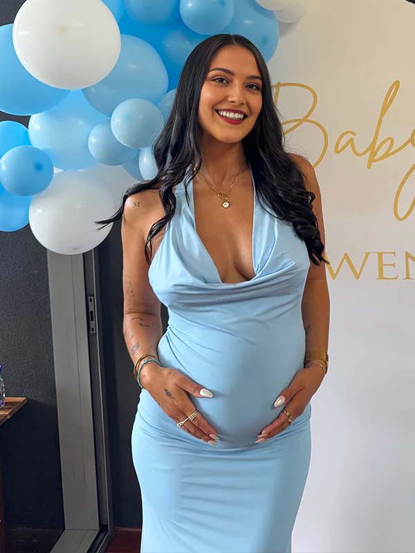 Momyknows Blue Ruched Cowl Neck Backless Mermaid Maternity Maxi Dress