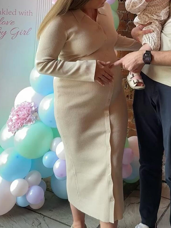 Momyknows Apricot Turndown Collar Crochet Button Maternity Sweater Baby Shower Maxi Dress