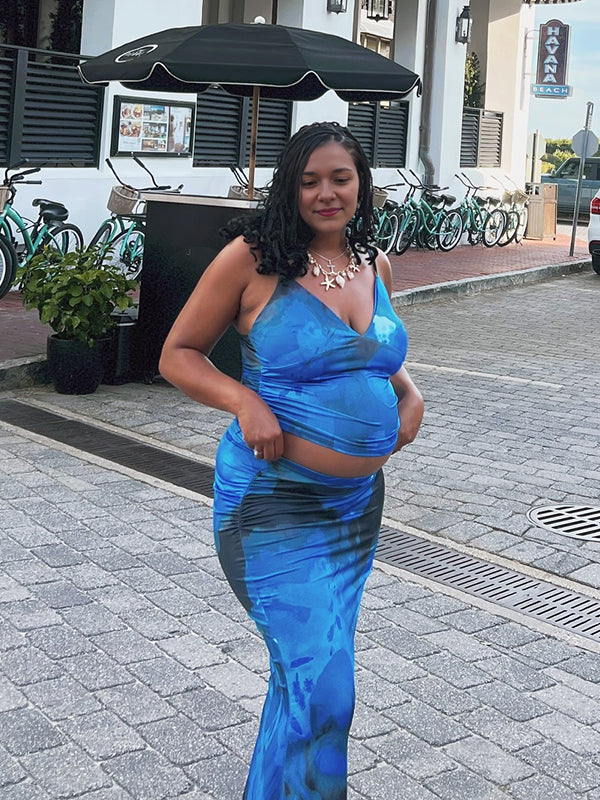 Momyknows Sky Blue Print Spaghetti Strap Two Piece Maternity Photoshoot Maxi Dress