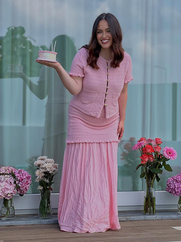 Momyknows Pink Crochet Pleated Button Two Piece Maternity Baby Shower Maxi Dress