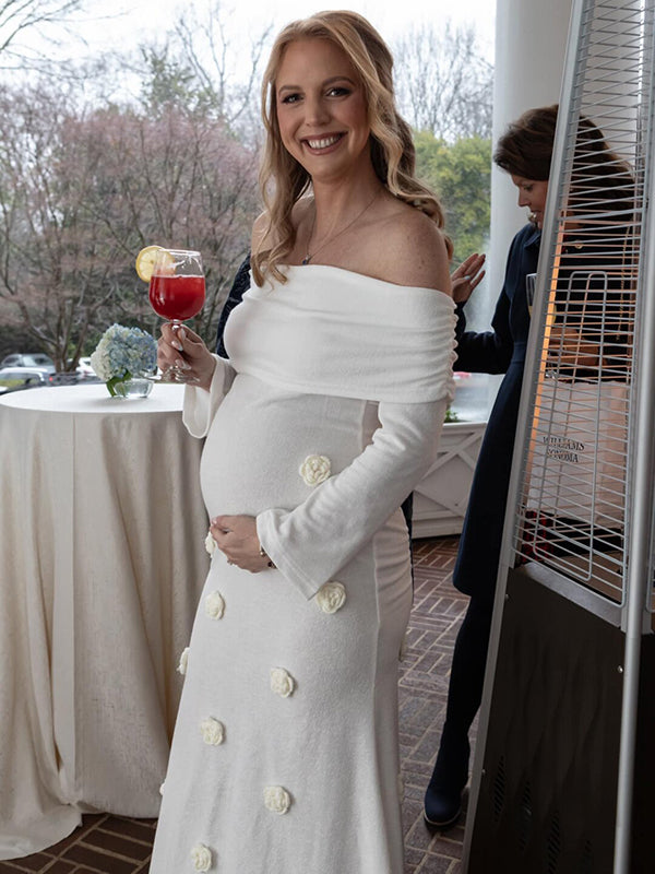 Momyknows White Off Shoulder 3D Flowers Knitting Sweater Baby Shower Maternity Maxi Dress